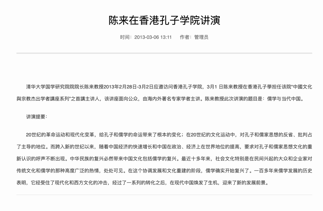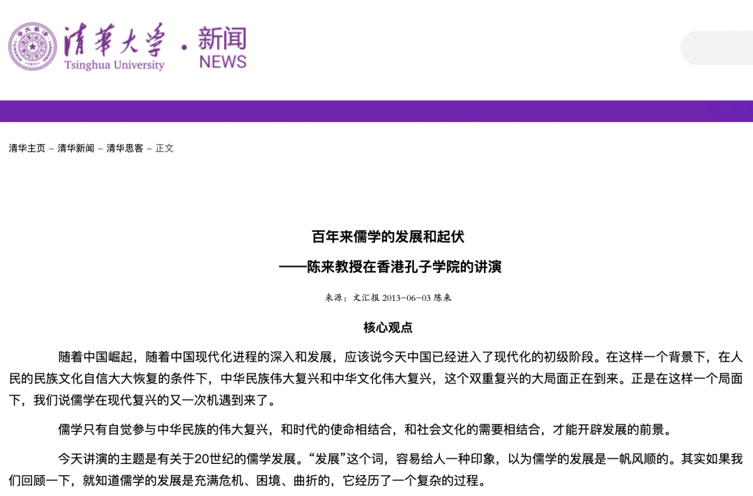 21世纪以来,国学热兴起,陈来担任了清华大学国学研究院院长。清华大学国学院曾经是中国近代教育史上的传奇性的存在。这种传奇性首先体现在他们所聘请的“四大导师”身上的“魅力”值,无论是梁启超、王国维还是新一代的陈寅恪和赵元任,身上都有“历史大变局”所赋予的政治、社会“影响”加持,而且还发生了1927年王国维跳昆明湖自杀这样的引发全社会讨论的事件。其次,清华国学院在学术风格,在方法上是“科学”的,在情感上强调国家认同和民族情感。与晚清国粹派的学术关切既有联系有迥然有别。